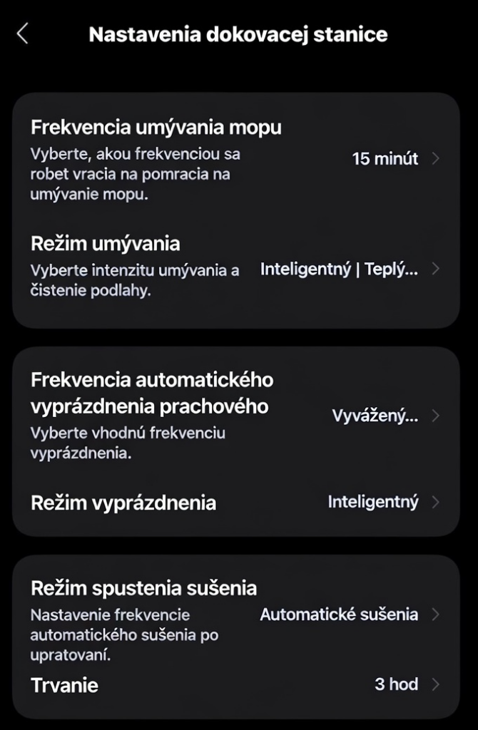 V podstate vieme upraviť všetky funkcie stanice. Napríklad frekvenciu prania mopov (podľa miestnosti alebo podľa času). Chýbalo nám síce nastavenie podľa štvorcových metrov, ale aj tak zostal vysávač veľmi pohodlný na používanie.