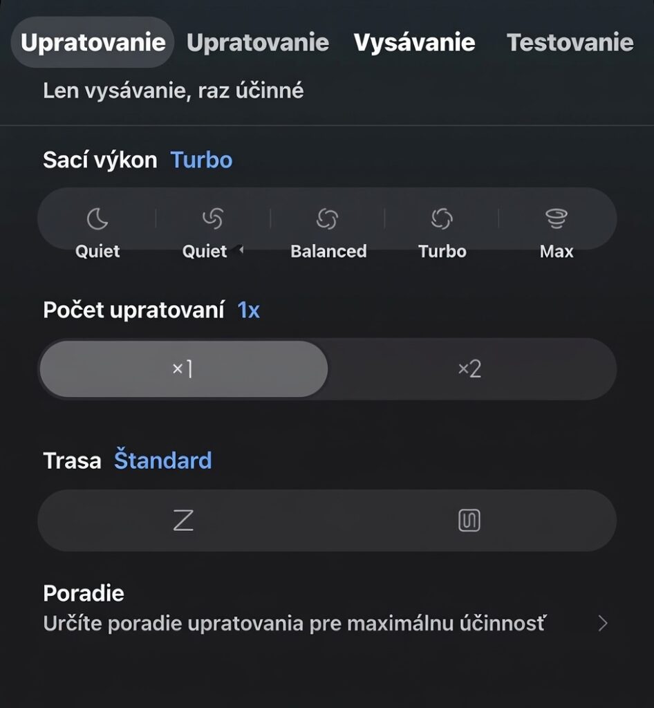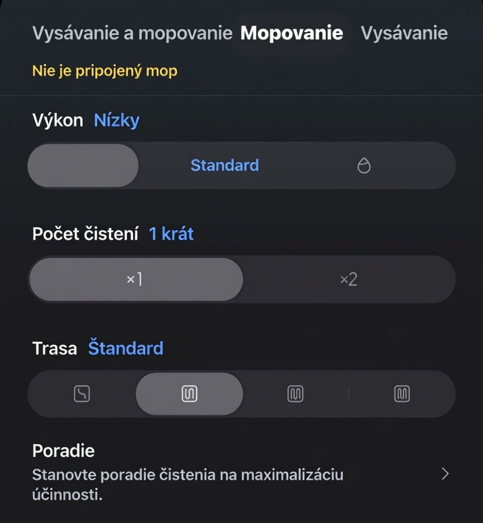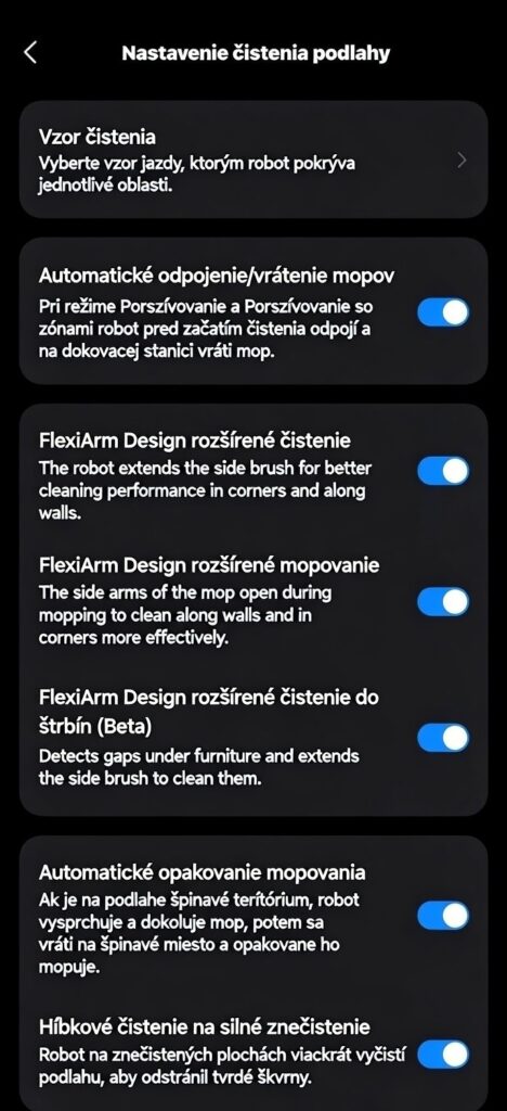 Okrem saciej sily tu nastavujeme aj odpojenie mopov – či zostanú v stanici –, a aj zdvíhanie mopov. V praxi je to úžasný zážitok, pôsobí to futuristicky, keď malý mechanizmus viditeľne zdvihne mop hneď, ako zistí koberec.