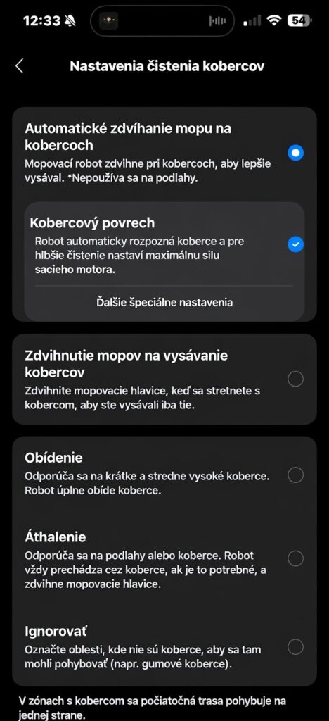 Aplikácia ponúka veľa možností pre vysávanie aj pre nastavenia spojené s kobercami. Môžeme vybrať, či sa im má úplne vyhnúť, ignorovať ich alebo cez ne normálne prejsť.